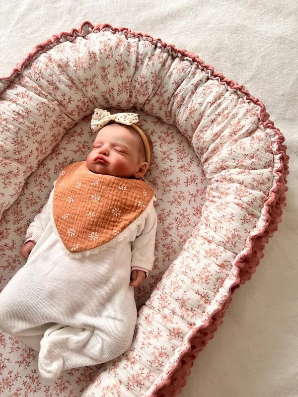 Le cocon est composé de deux matières différentes afin d'accompagner bébé en toute saison de l'année : le motif sera en coton (partie pour le printemps/été - mais peut également être utilisé l'hiver et l'automne - et une partie en minky tout doux (partie pour l'automne/hiver). L'intérieur du boudin est rembourré en ouate et le fond comprend une mousse épaisse d'environ 0,5mm.