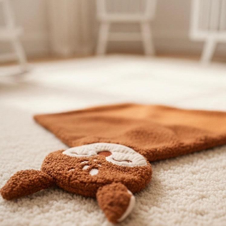 La tête présente une texture douce et un tissu double gaze pour l'éveil tactile, tandis que le corps en moumoute/bouclette couleur terre cuite offre une surface rassurante et moelleuse pour de longs moments de réconfort.